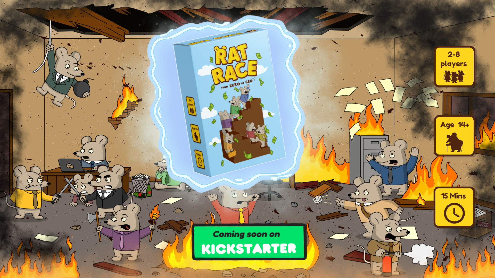 Rat Race us a fast and fund party game where you play as a rat in a tie, competing to become the new CEO of the company… or, if you prefer, to fire all your coworkers!